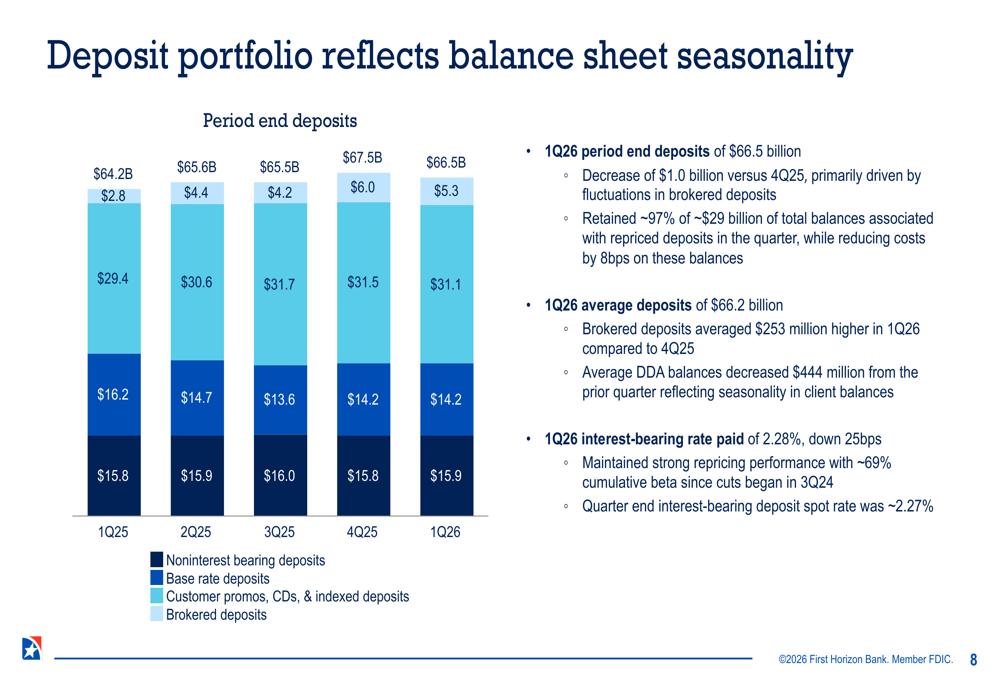 Period-end deposits of $66.5 billion decreased by $1.0 billion from the fourth quarter, primarily driven by fluctuations in brokered deposits, which the bank actively manages as a funding tool. Average demand deposit account balances declined $444 million from the prior quarter, consistent with seasonal patterns. The bank’s deposit mix shows 24% in noninterest-bearing accounts, with the remainder split between base rate deposits, promotional products, and brokered funding.