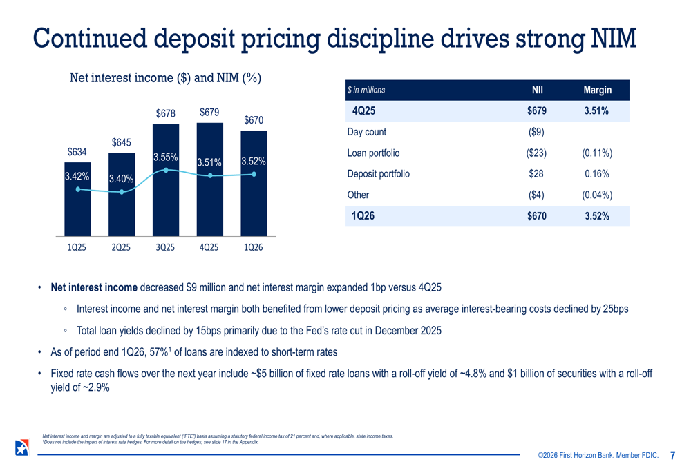 First Horizon’s margin expansion story centers on disciplined deposit pricing in an increasingly competitive environment. The bank demonstrated strong execution in managing its funding costs while retaining customer relationships.